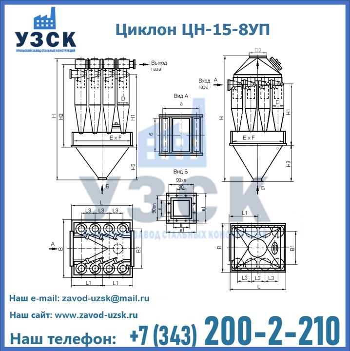 Завод «УЗСК» в Кемерово предлагает большой выбор циклонов ЦН-15-500×8УП и прочих устройств, полностью укомплектованных и готовых к эксплуатации. Мы гарантируем соответствие оборудования всем требованиям ГОСТ и ТУ, износостойкость и высокую производительность предлагаемого оборудования. Уральский Завод Стальных Конструкций изготавливает и продает надежное, эффективное и производительное оборудование, имеющее длительную гарантию и большой эксплуатационный ресурс. Если требуется изготовить циклон нестандартных размеров, то такой вариант выполнения заказа тоже предусмотрен, так как предприятие имеет собственные производственные площади и надежных поставщиков. На все поставляемое или производимое оборудование имеются чертежи и прочая техническая документация. Заказать и купить циклоны или прочее оборудование высокого качества и по доступной цене можно через наш сайт или по указанному в разделе «Контакты» телефону.
